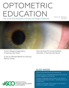 Drs. Mark Dunne and Bhavna Pancholi of Aston University are this year’s recipients. Their article, Virtual Patient Instruction and Self-Assessment Accuracy in Optometry Students, was published in the Winter-Spring 2018 (Volume 43 Number 2) of Optometric Education.