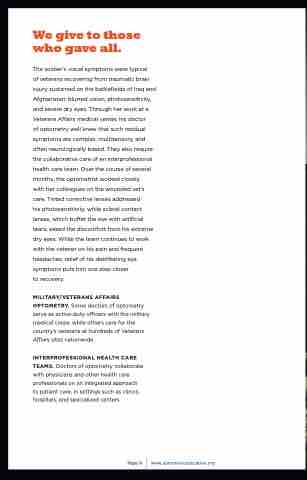 of veterans recovering from traumatic brain injury sustained on the battlefields of Iraq and Afghanistan: blurred vision, photosensitivity, and severe dry eyes. Through her work at a Veterans Affairs medical center, his doctor